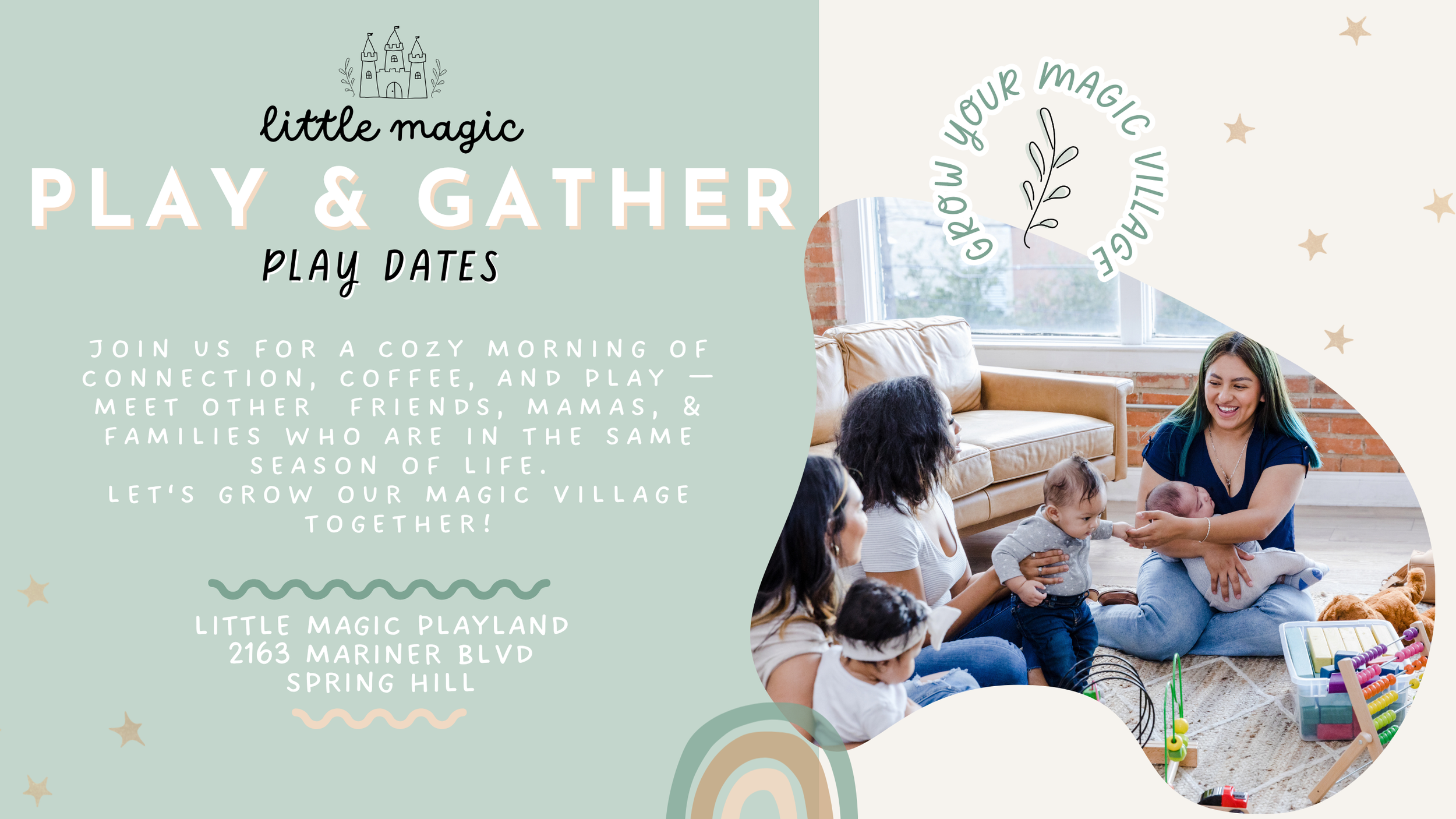 Play & Gather was created to bring families together in a space where little ones can play freely and grown-ups can slow down, connect, and feel supported. Attend our play dates or create your own by joining our Play & Gather Facebook Group. Come grow your village with us!